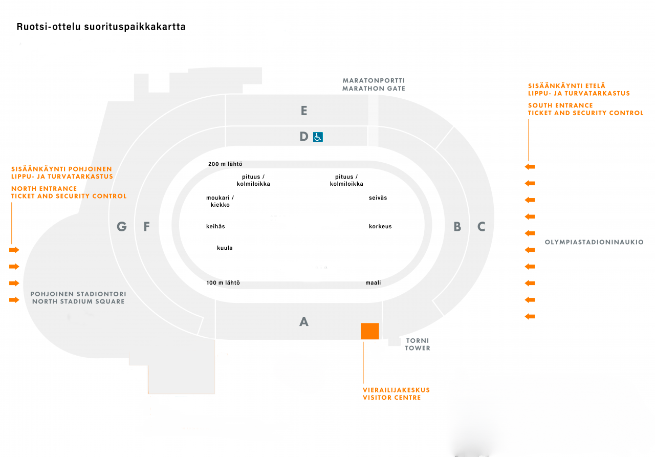 Pyörätuolipaikat sijaitsevat esteettömässä D-katsomossa. Olympiastadion tarjoaa sujuvat ja turvalliset puitteet kaikille katsojille.